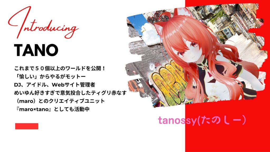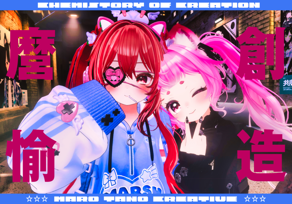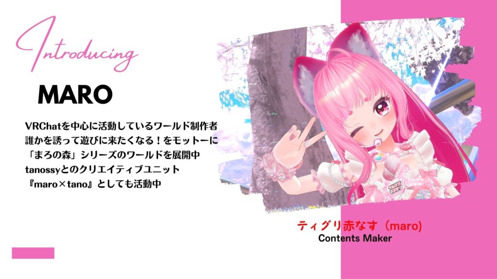 もともとVRChatでワールドを制作していたティグリ赤なす(maro)とNeosVR(※現在のResonite)でワールドなどを制作していたtanossyの二人が他には無い楽しく可愛いコンテンツを創り出していこう!と組んだクリエイティブユニットです。
